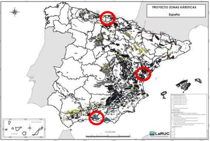 En este proyecto se ha estudiado en detalle uno de los factores geológicos que puede originar concentraciones elevadas de radón, y que no se contempla en la actualidad en el mapa de radón: los sistemas kársticos que se muestran en la figura 1, localizados en las zonas de Cantabria, Málaga y Castellón de la Plana. Con ello se ha contribuido a un mejor conocimiento de la dinámica del radón en este tipo de sistemas y, por lo tanto, a mejorar el conocimiento sobre la exposición al radón en España. El presente artículo recoge un extracto de los principales resultados obtenidos con referencia a cada uno de los objetivos que forman parte del proyecto financiado por el Consejo de Seguridad Nuclear, desarrollado entre diciembre de 2021 y diciembre de 2024.